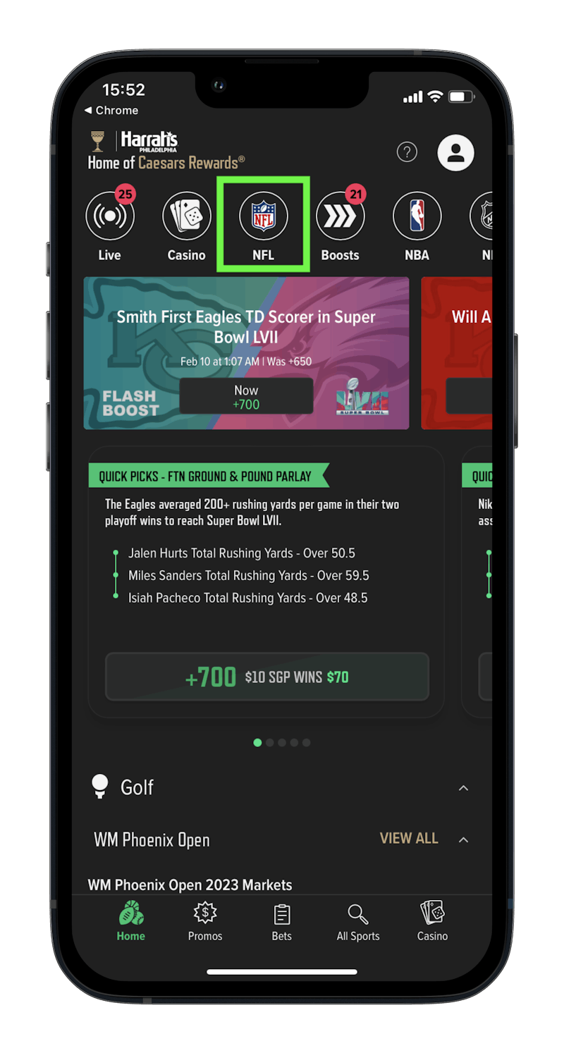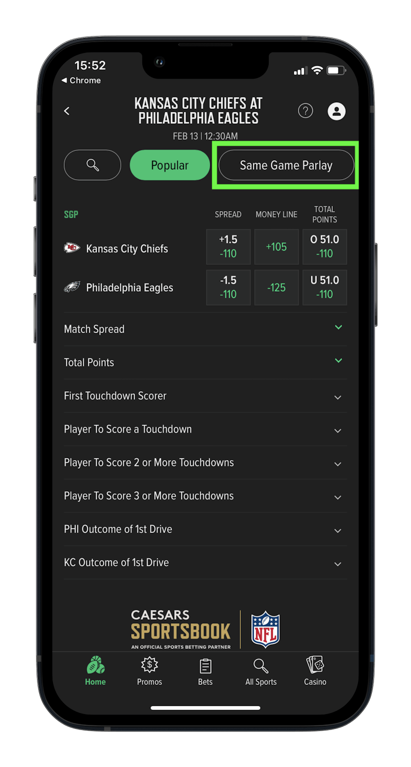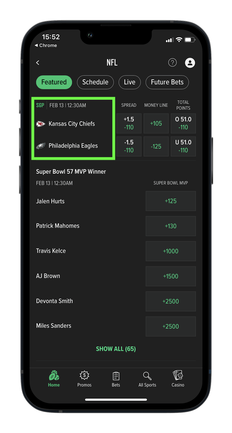 Once you've made your way to the NFL tab, click on the matchup box (highlighted in green) to access all the markets, including the Same Game Parlay tab, for this year's Super Bowl matchup.