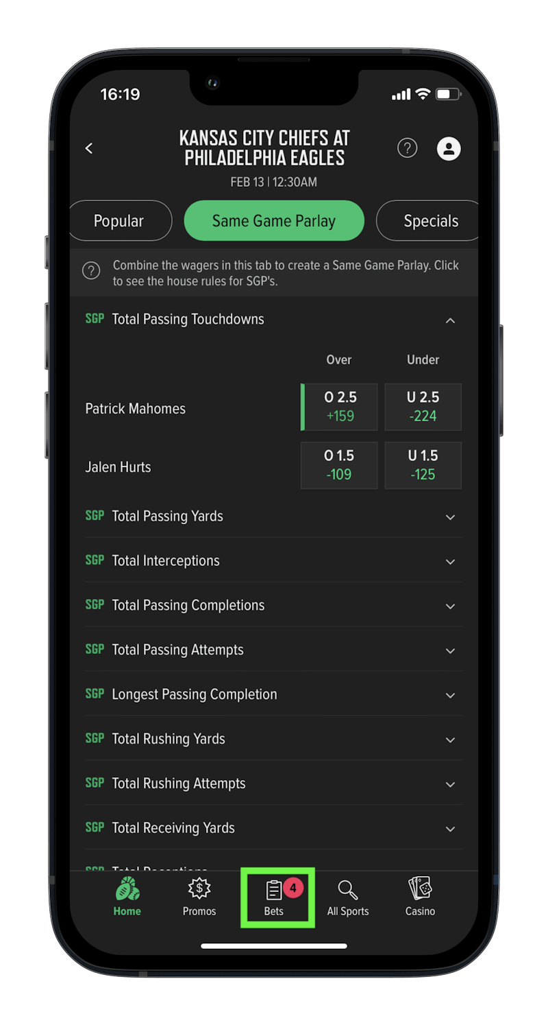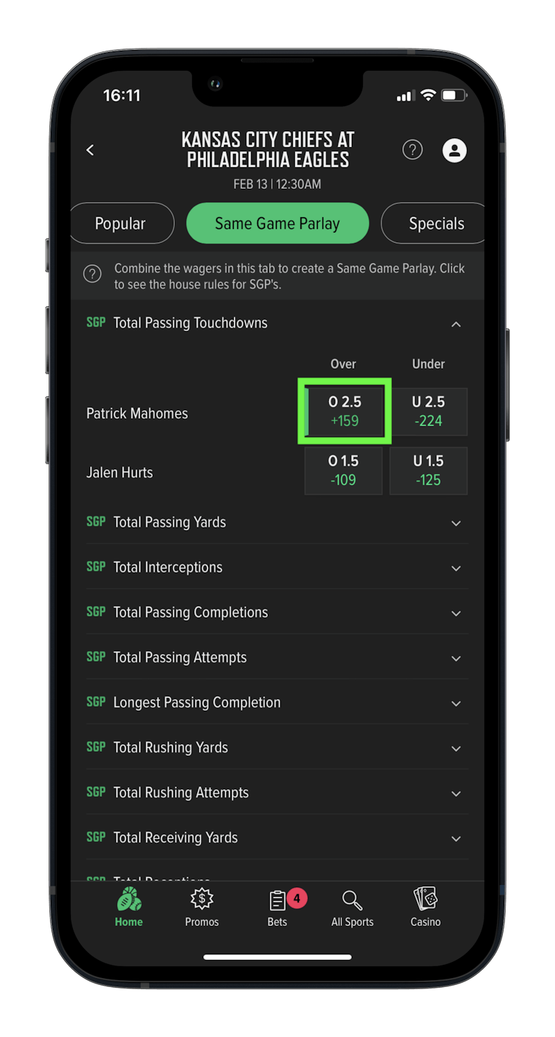 Now that you have accessed the Same Game Parlay tab for this year's Super Bowl game, you can scroll through all the available wagers, including things like Total Receptions, Player to Score a Touchdown, and Total Yards Thrown among many others, and simply tap on the ones you wish to include in your Same Game Parlay.