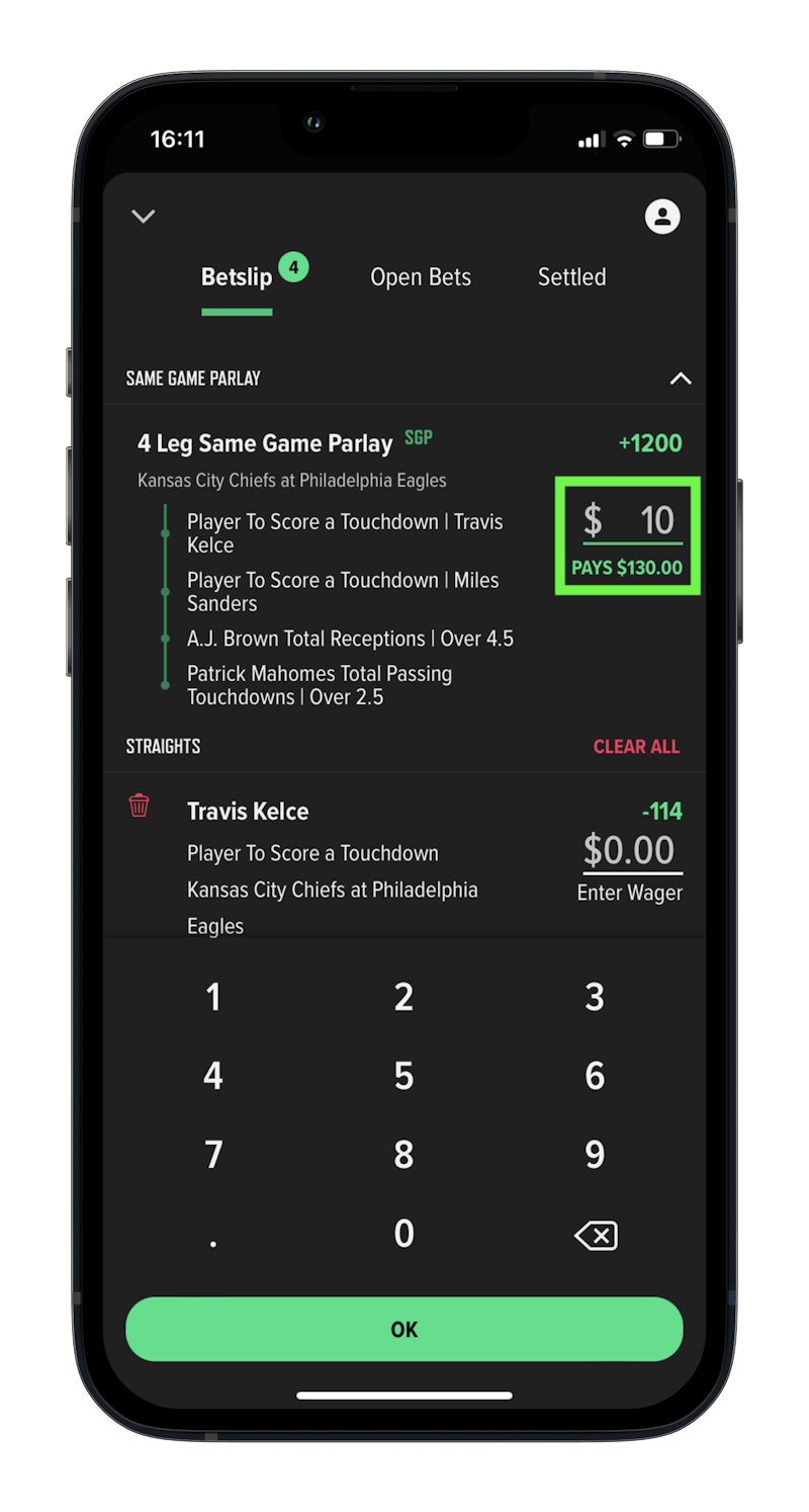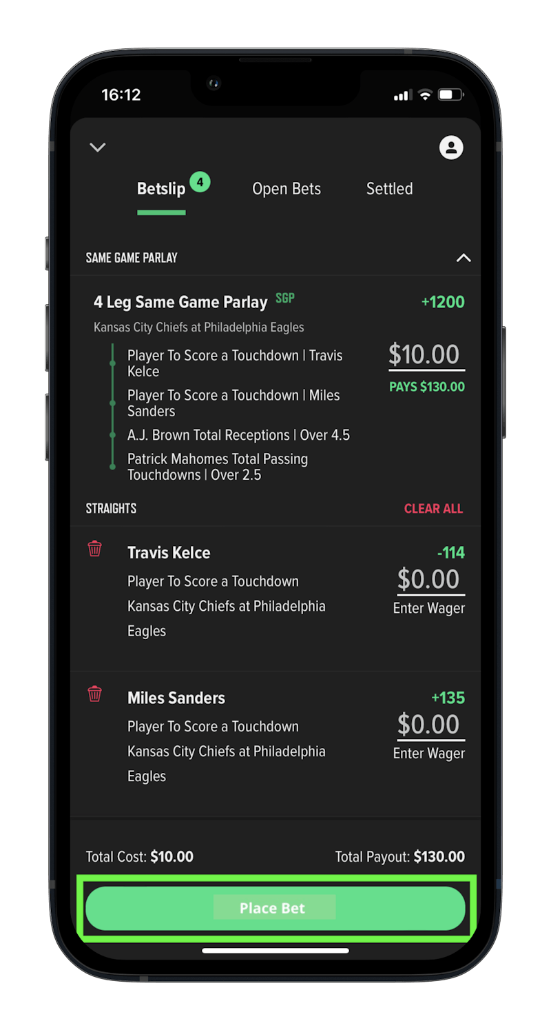 The last step in placing your Super Bowl Same Game Parlay is to double-check your bet slip to make sure all the bets you want to include in the parlay are there and that the amount you wish to wager is correct.