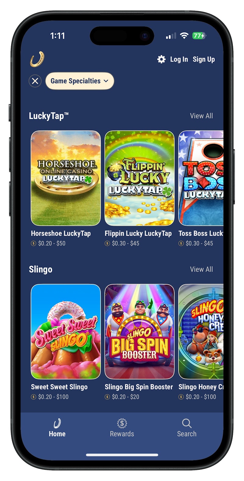 Under Horseshoe's Game Specialties, users can find arcade-style options, specialized slots, and more. Here is where Lucky Taps, Keno, Slingo, Bonus Buys, and Megaways are all neatly tucked.