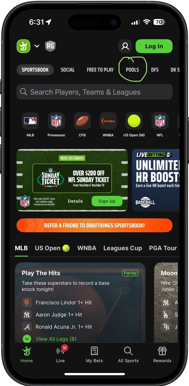 Next up, navigate to the "Pools" section of DraftKings Sportsbook. It is toward the top of the app and the site.