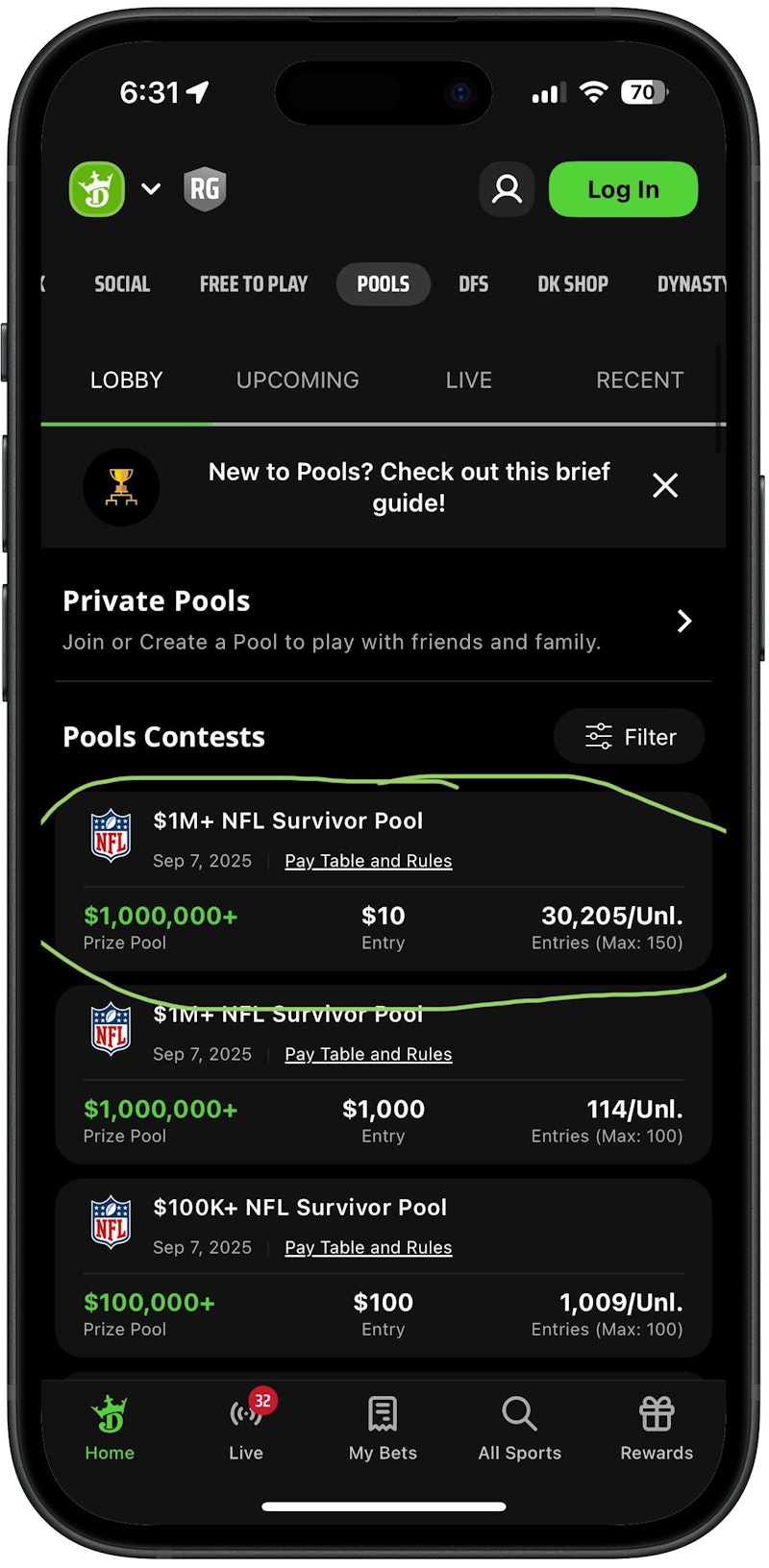 DraftKings has multiple NFL Survivor pools for the 2025 season. Each one has different entry fees, payouts, participants, and rules. However, the primary pool is the $10 entry fee with the $1,000,000+ prize pool. The Bet & Get promo yields a ticket for this pool.
