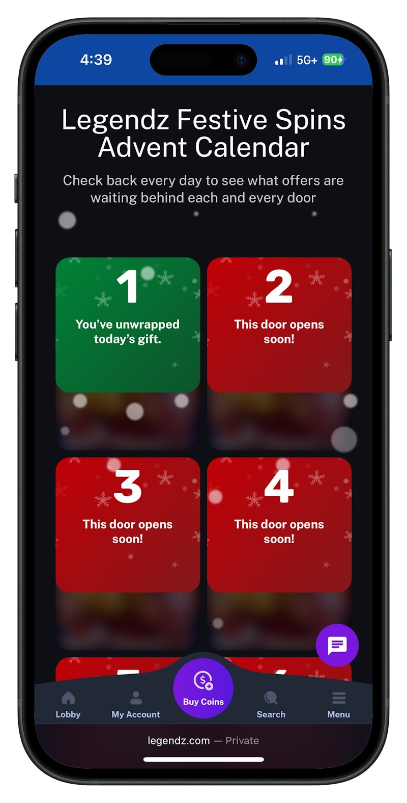 Every day, players can claim a gift, such as free spins, that can be used for that day. Every gift in the Legendz Advent Calendar is in Sweeps Coins! That means you get a free shot at turning these gifts into money, gift cards, and other prizes.