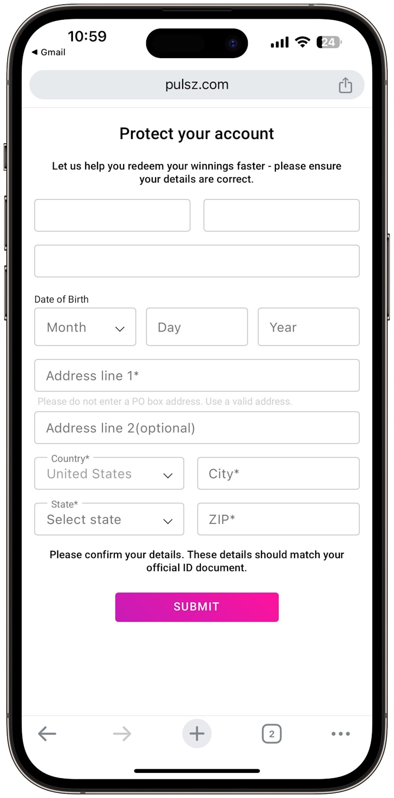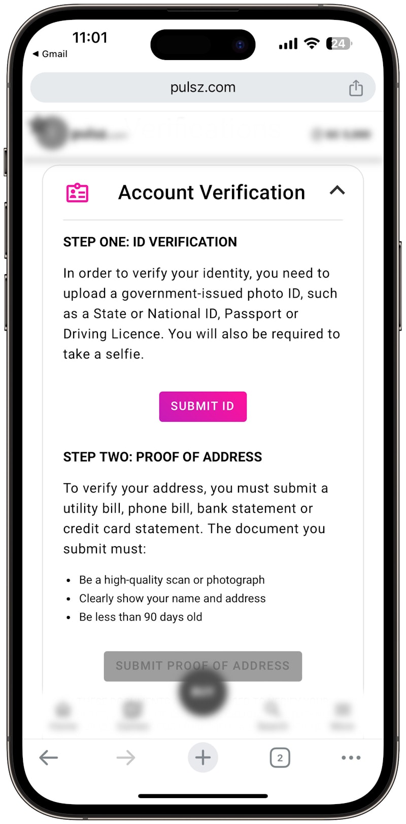 - Verify Your Account (first redemption only): Submit identification documents for verification purposes. Pulsz typically processes these within 48-72 hours.