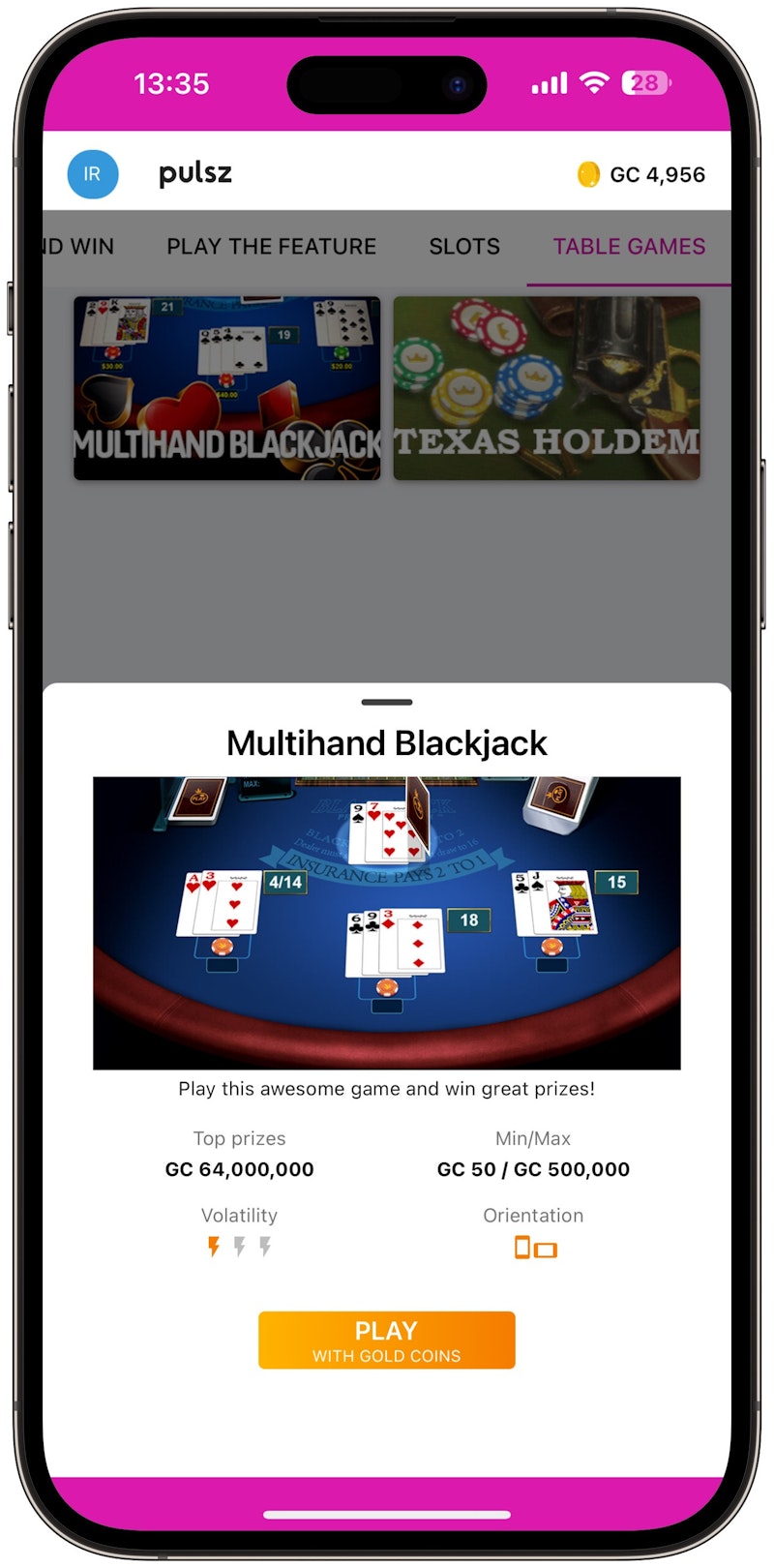 While Pulsz focuses primarily on slot games, it also includes a limited selection of table games. Currently, players can find digital versions of classic games like Blackjack and Texas Hold'em. Although the variety of table games may be more limited compared to the slots library, these games provide a nice change of pace and a touch of traditional casino gameplay.