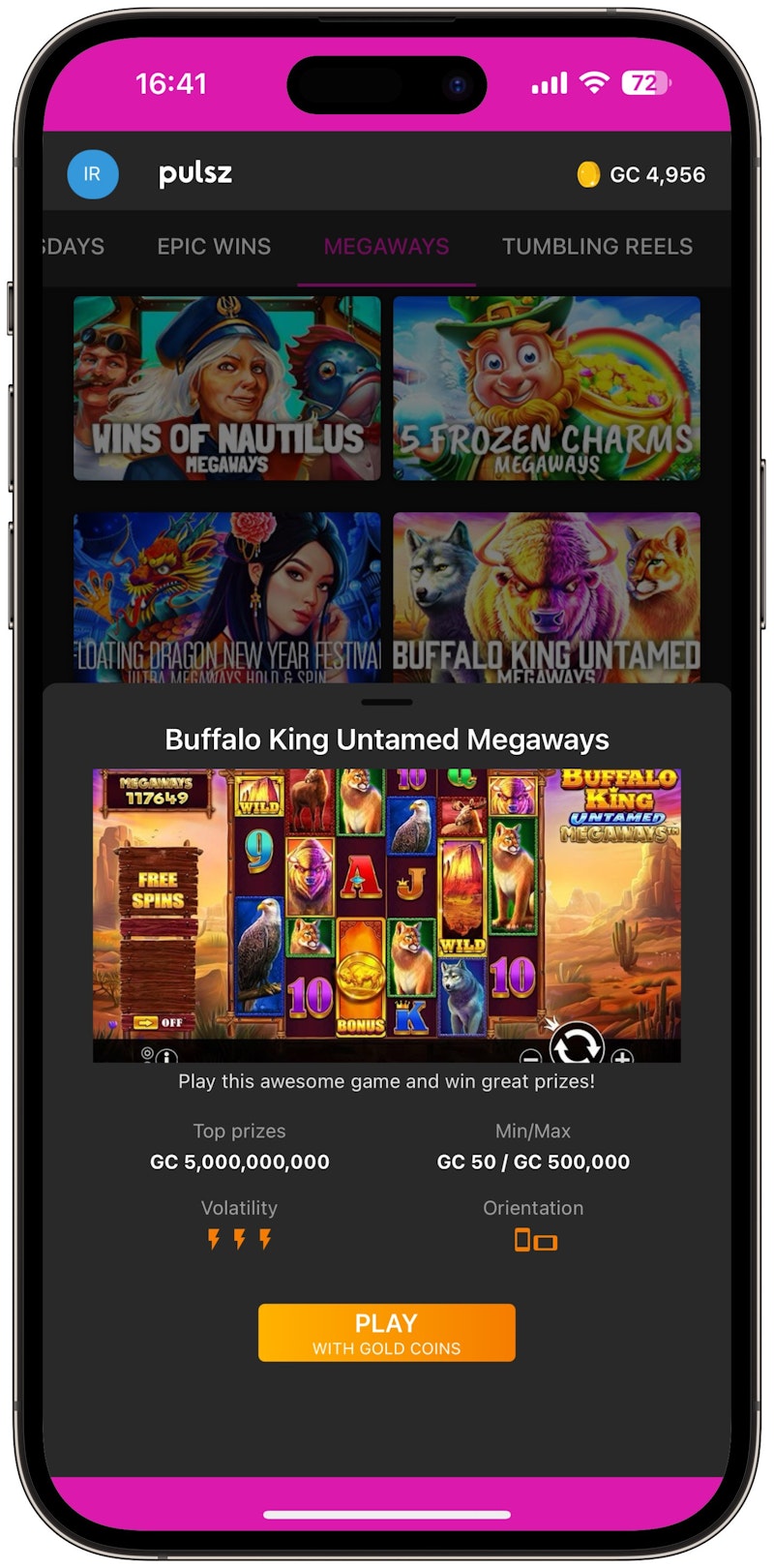 - Megaways Slots: Megaways slots are known for their dynamic paylines that can create thousands of winning combinations in a single spin. Pulsz offers a variety of these high-intensity games, providing big win potential and excitement.