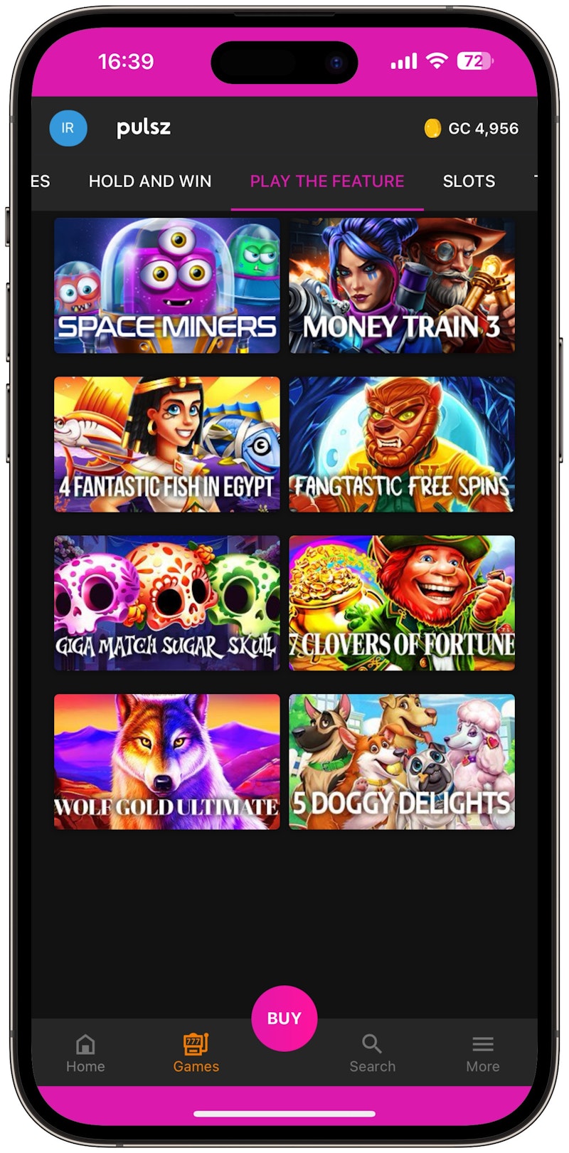 In addition to traditional slot types, Pulsz includes Hold and Win and Play the Feature games, both popular among players looking for additional rewards and gameplay twists: