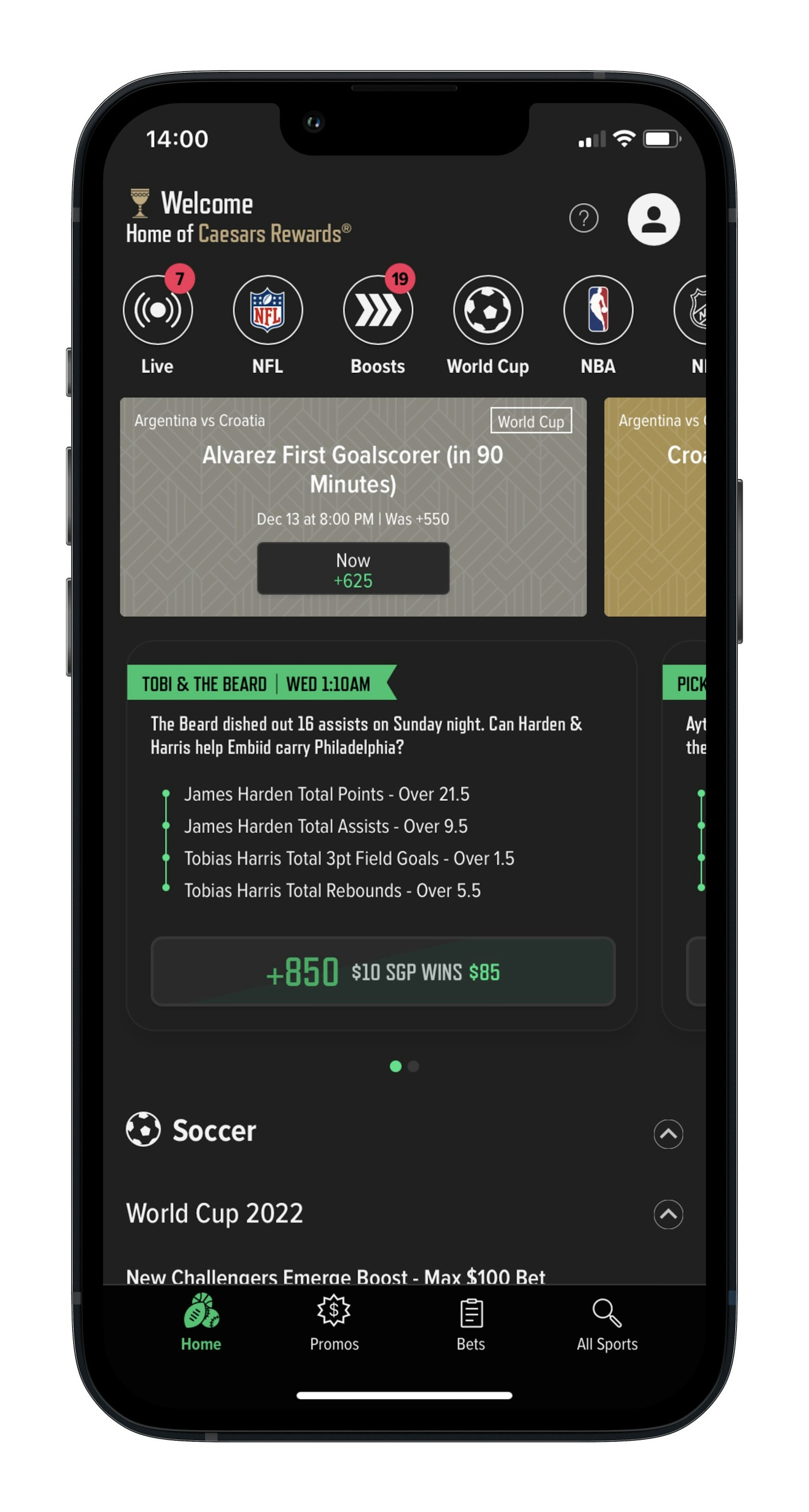 Get 20 100% Profit Boosts After Your First Real Money Wager of $1 21+ only. New customers only. Must use Promo Code UNITED20X. AZ/CO/IL/IN/IA/KS/KY/LA/ME/ MA/MD/MI/NJ/NY/NC/OH/PA/TN/VA/WV/WY/DC only. Deposit required (min $10). Must place first real money Qualifying Wager (min $1) within 30 days. Receive twenty 100% Profit Boosts to use on any market. Maximum wager for each profit boost is $25. Maximum additional winnings for each rewarded profit boost is $2,500. Profit Boosts expire 14 days after receipt. See full T&C at Caesars. | |||||