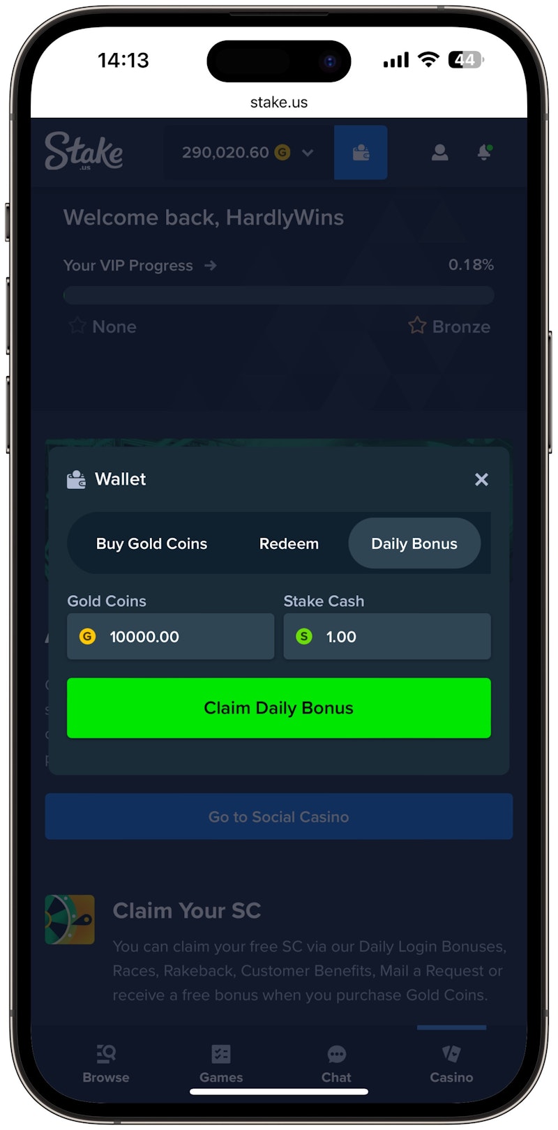 If your Stake wallet ever holds fewer than 10 Gold Coins, you can claim a Top-Up to receive 1,000 Gold Coins, allowing you to keep playing without interruption.