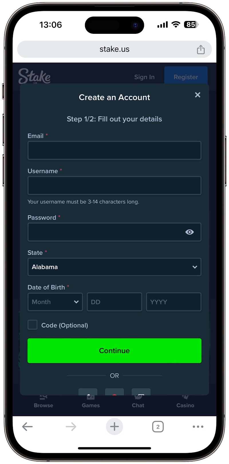 First and foremost, you must visit Stake.us to begin the registration process. You can complete the registration process from your mobile web browser or desktop computer, so whichever device you are using to read this guide will work!