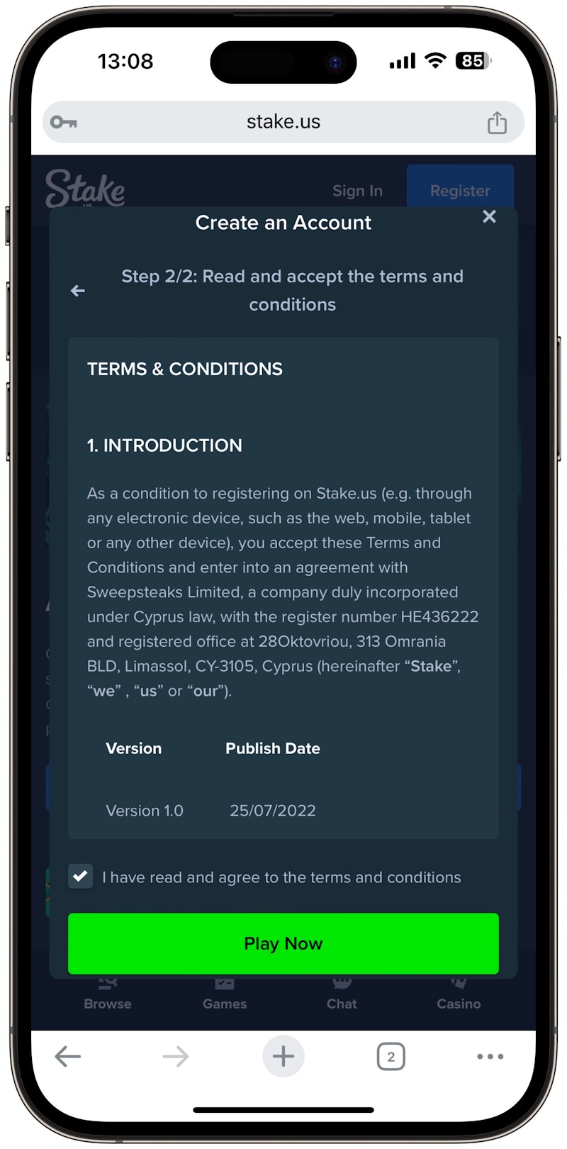 Once you have accepted the terms and conditions, click the "Play Now" button to finish registering your account.